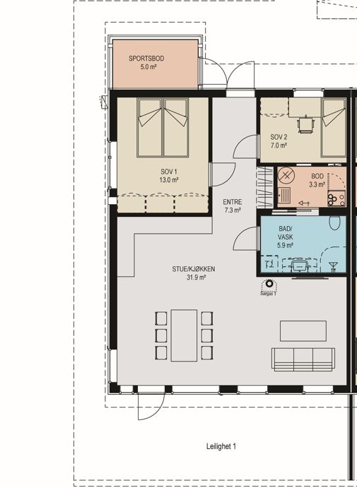 Leilighet 1 er ledig og til salgs. Leilighetens oppholdsrom er på hele 36 m2 og har store vinduer med terrassedør ut til en solrik og lun veranda. De store vinduene gjør leiligheten lys og trivelig. Her er det plass til både sofagruppe, spisebord og kjøkkenet blir en naturlig del av rommet. Leiligheten består av entre, 2 (3) soverom, bad/ vaskerom, bod, stue og kjøkken.